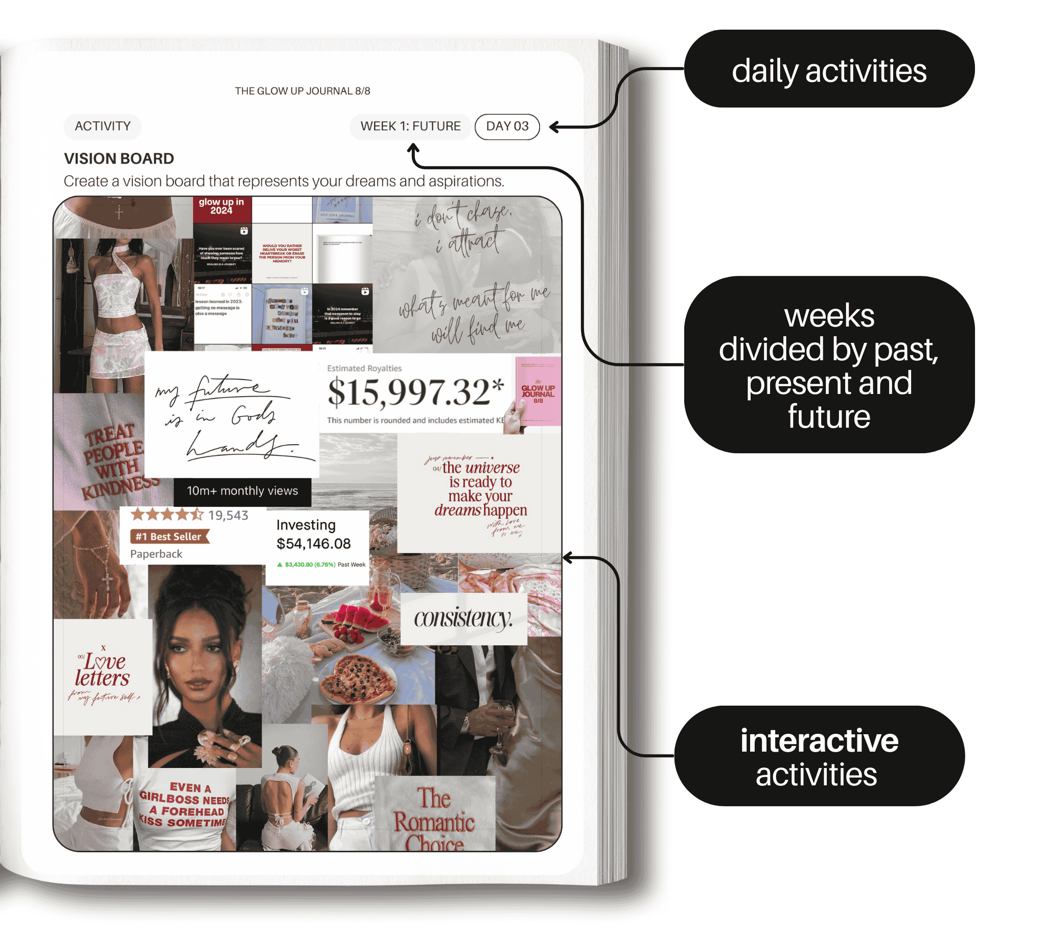 ✨ DAILY ACTIVITIES: +50 interactive exercises, journaling, vision boarding, burning a letter and goal-setting.